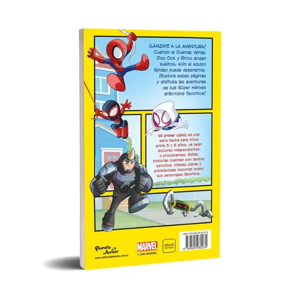 ¡LÁNZATE A LA AVENTURA! Cuando el Duende Verde, Doc Ock y Rhino andan sueltos, solo el equipo Spidey puede detenerlos. ¡Explora estas páginas y disfruta las aventuras de tus Súper Héroes arácnidos favoritos! Mi primer cómic es una serie hecha para niños entre 5 y 8 años, ya sean lectores independientes o principiantes. Estas historias cuentan con textos sencillos, viñetas claras y entretenidas historias sobre sus personajes favoritos.
